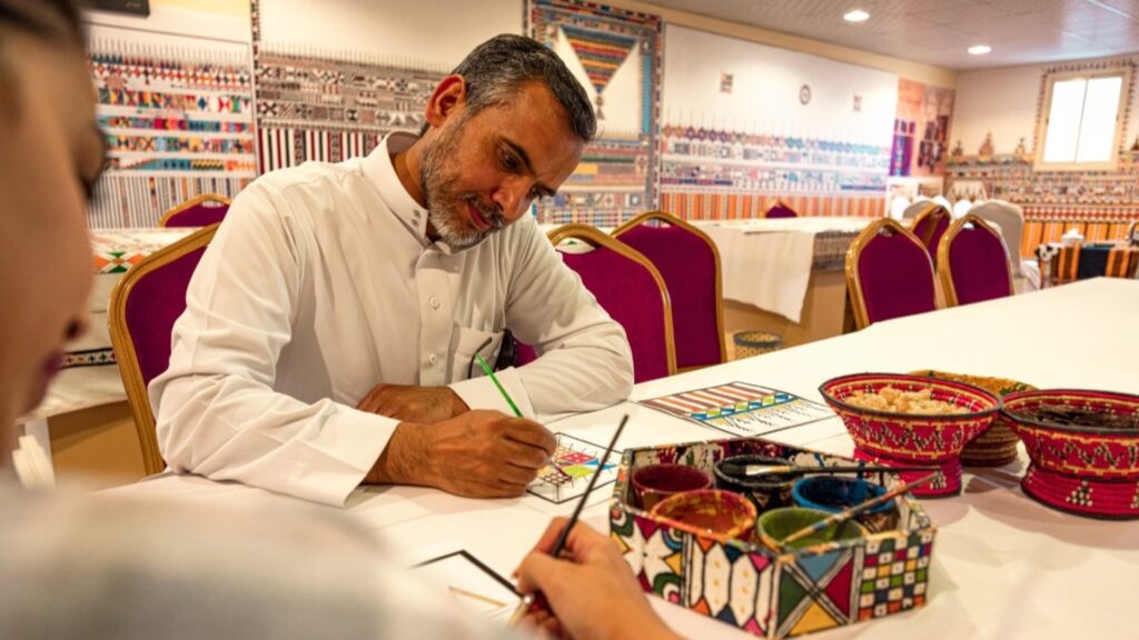 2017’de UNESCO Somut Olmayan Kültürel Miras listesine giren bu canlı kadın sanatı geleneği, nesiller boyunca Asir evlerini süsleyen geometrik desenler ve parlak renklerle bilinir. Alçı, kömür ve bitki özleri gibi doğal pigmentlerle yapılan Al-Qatt, geleneksel olarak bir ailenin zenginliğini ve statüsünü göstermek için kullanılırdı.